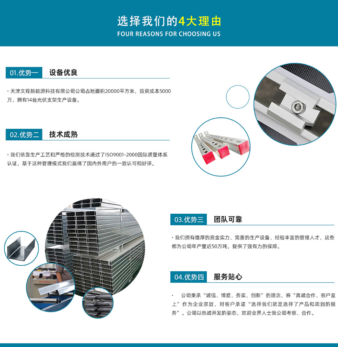關于我們天津文程新能源科技有限公司成立于2021年,是專注于集中式、分布式、漁光互補和農(nóng)光互補等清潔能源發(fā)電的綜合性企業(yè) 公司是集設計、研發(fā)、生產(chǎn)、制造為一體的綜合型企業(yè)。公司占地面積20000平方米,注冊資金5000萬元整。公司坐落于華北鋼鐵重鎮(zhèn)--大邱莊,距天津市區(qū)50公里、鄰104和205國道及京滬高速,交通十分便捷。 本公司擁有三個生產(chǎn)車間,其中兩個冷彎型鋼車間,一個鋅鋁鎂型鋼車間,擁有自動冷彎成型機10條,自動數(shù)控沖孔機10條以及焊接加工等設備。主要生產(chǎn)產(chǎn)品有:太陽能光伏支架、各種規(guī)格的C/Z/U型鋼、抗震支架、管廊支架及整套配件等。